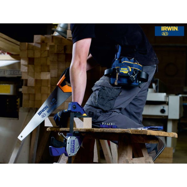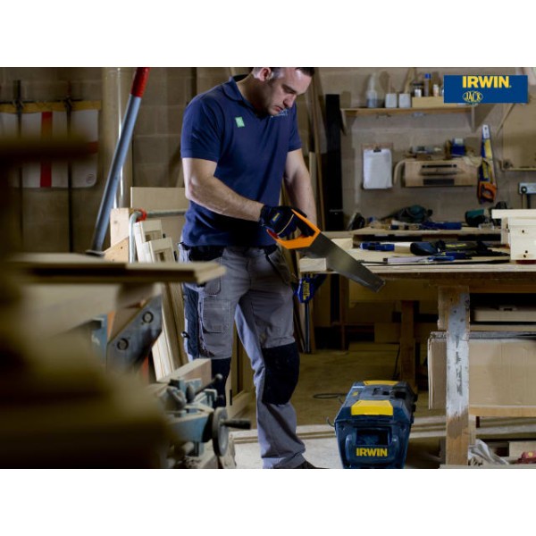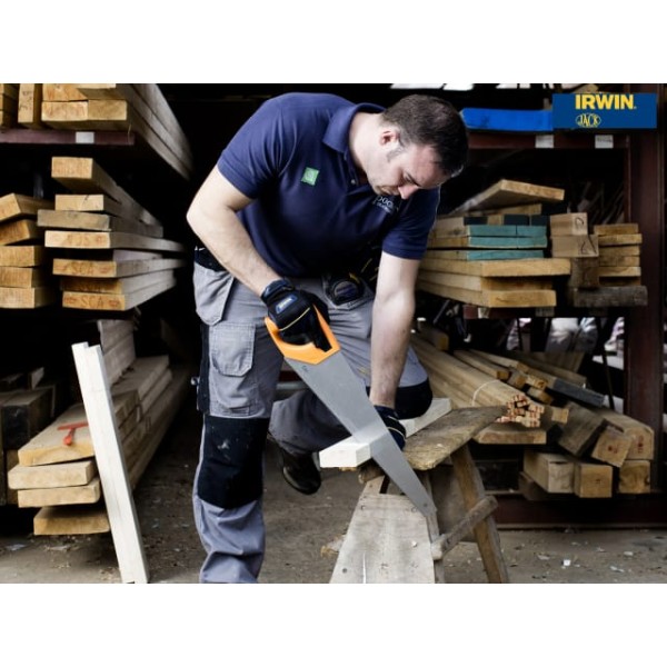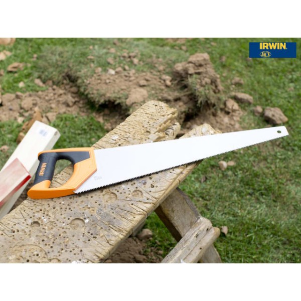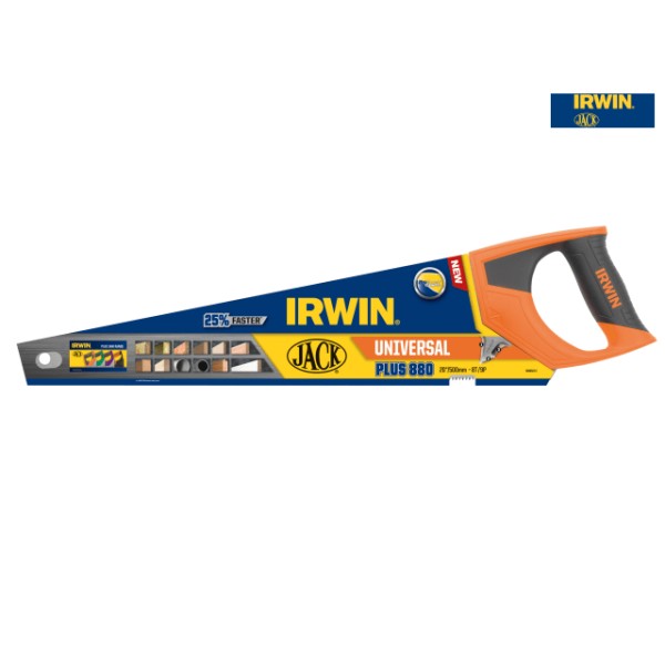 The IRWIN Jack Jack Universal 880 Triple Ground Hardpoint Saw is fitted with a high quality C75 steel blade and features a unique Triple Ground tooth design offering up to 25% faster cutting performance than traditional double ground saws. The blade is treated with a water based lacquer providing four times the added protection than conventional anti-rust agents.