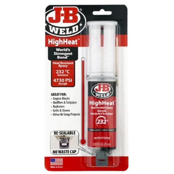 J-B Weld HighHeat™ is a heat-resistant epoxy adhesive for bonding and gap filling substrates exposed to high temperatures up to 260°C (500°F). Resistant to water, chemicals and heat.