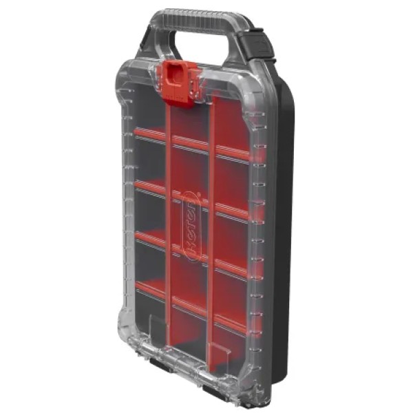 The Keter Stack N Roll Half Footprint Organiser has a transparent polycarbonate lid which offers easy visibility of all your contents. Its 15-section adjustable dividers allow you to customize the compartment layout to your specific needs. The IP54 seal protects contents from dust, moisture and accidental contact with water, is ideal for outdoor use. Fitted with a comfortable soft rubber carry handle. Fitted with a large carrying handle for convenient portability.