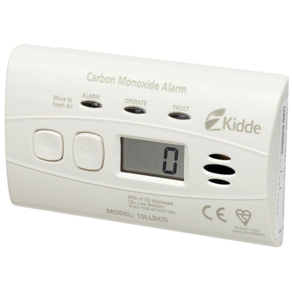 Its digital display clearly shows the levels of carbon monoxide. A peak level display allows the highest CO level recorded (between 11 - 999ppm) to be displayed. The 10LLDCO has a unique, water-based Kidde CO Electrochemical Sensor.