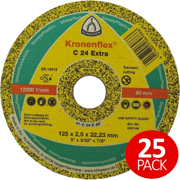 Klingspor relies exclusively on premium components for their Kronenflex cutting-off wheel C 24 Extra - from the bonding agent to the filler materials. A blend of perfectly matched components always delivers excellent cutting quality - for the intended application the product is designed for. The wheel is reinforced by a special glass fibre cloth. The resins and filler materials used for these wheels ensure reliable stability and high cutting performance and improve their hardness. These properties let them deliver uniform and professional results in any conditions of practical use. Better still, the wheels also prove to be exceedingly durable under heavy-duty use