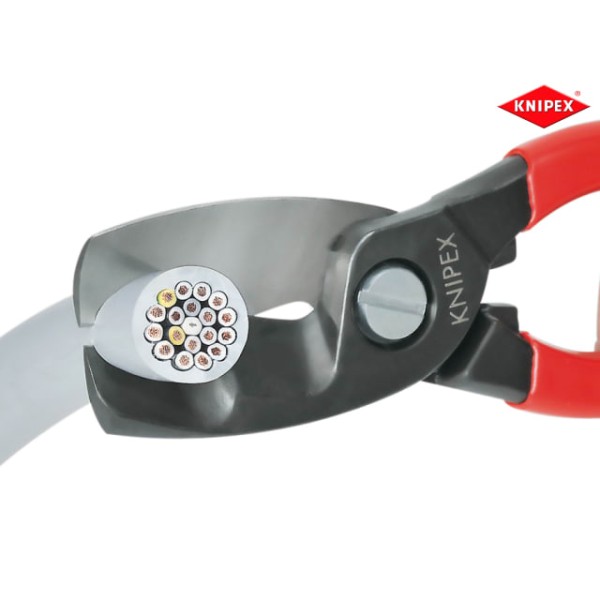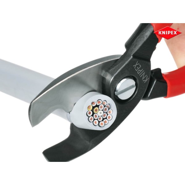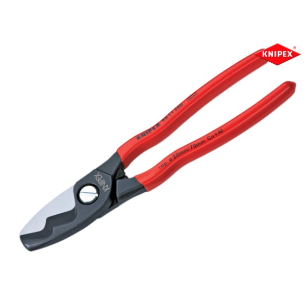 The Knipex 95 12 200 cable shears with twin cutting edges are ideal for cutting copper and aluminium cables, single and multiple wire cables but are not suitable for steel wire and hard drawn copper conductors.