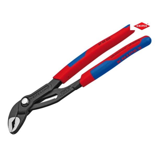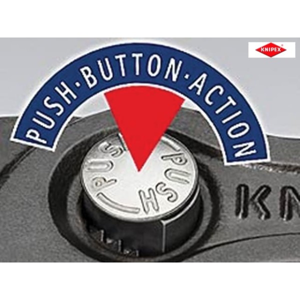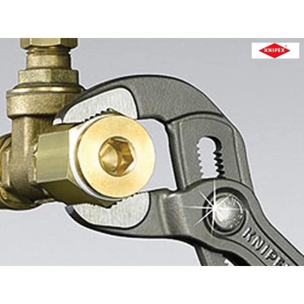 The Knipex KPX 87 02 250 Cobra water pump pliers have automatic adjustment. They can be opened and adjusted directly at the workpiece with one hand. The Cobra pliers close with a push of a button and offer a good strong grip on the workpiece.