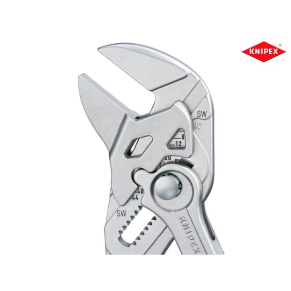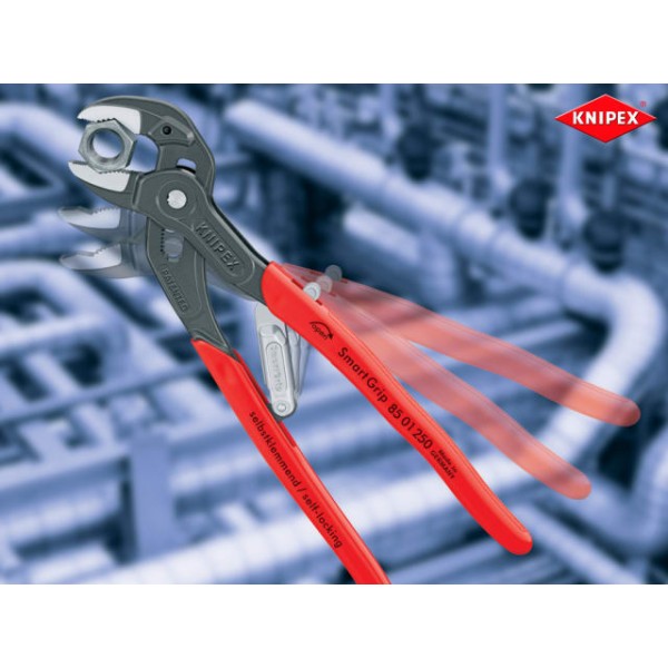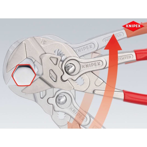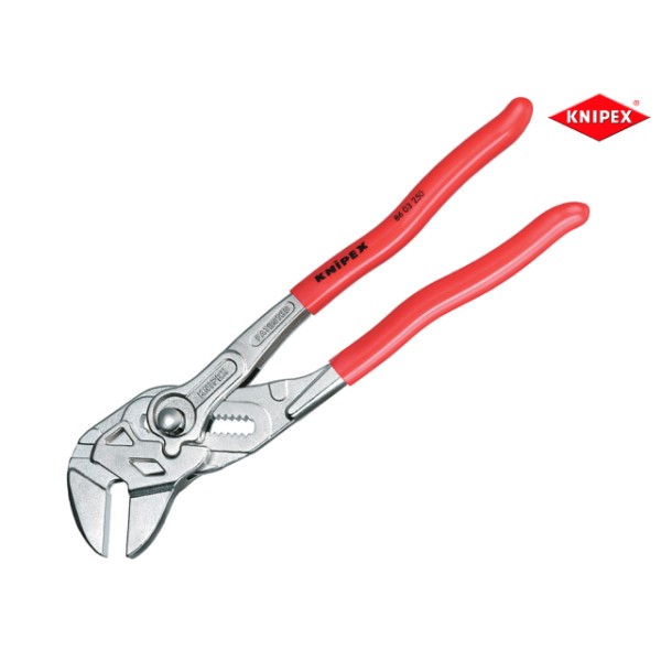 The Knipex 86 03 Series Pliers Wrench with dipped PVC handles and smooth parallel jaws for cautious installation of plated fittings or sensitive surfaces. More effective, faster and greater capacity than an adjustable spanner of the same size.