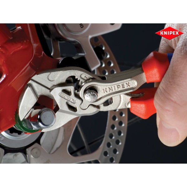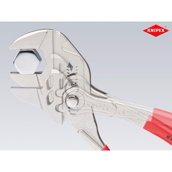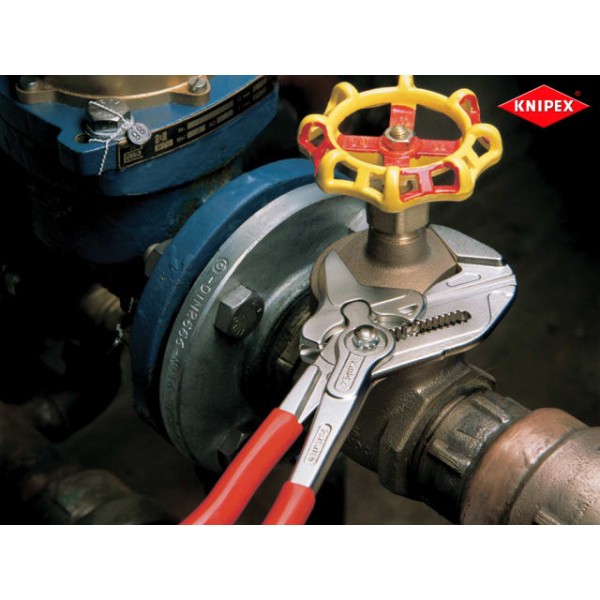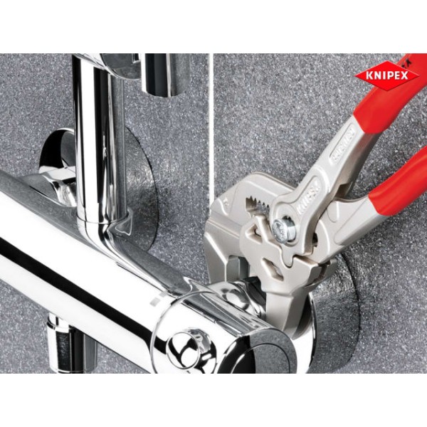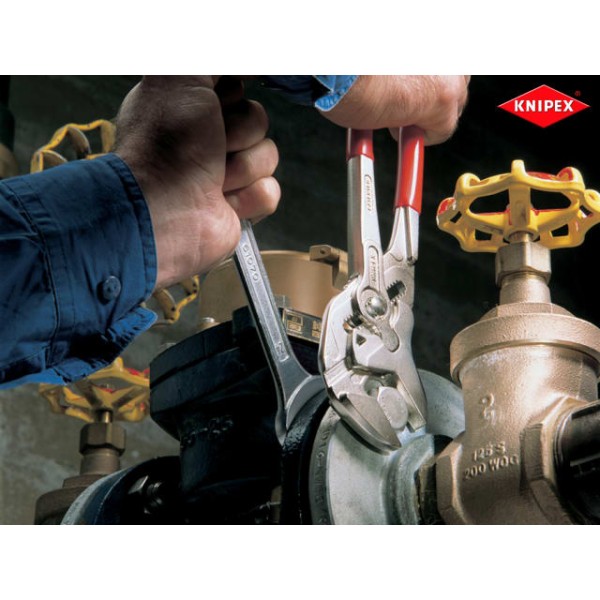 The Knipex 86 03 Series plier wrench with dipped PVC handles and smooth parallel jaws for cautious installation of plated fittings or sensitive surfaces. More effective, faster and greater capacity than an adjustable spanner of the same size.