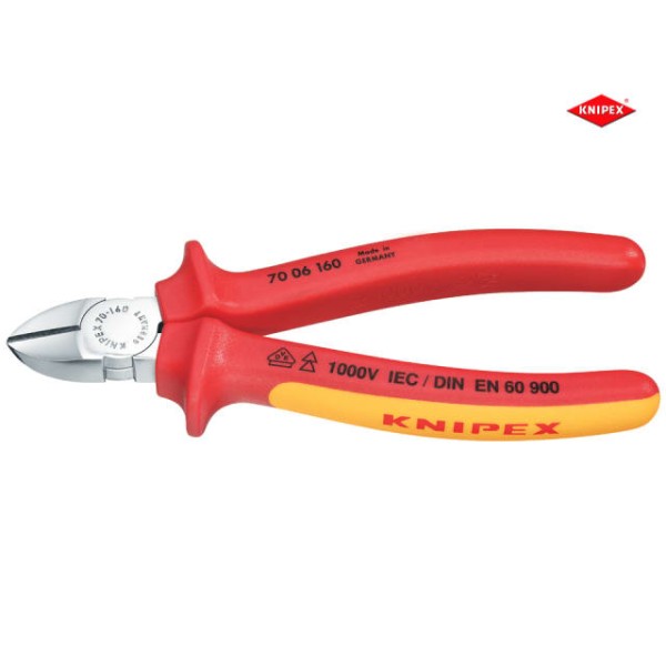 The Knipex 70 06 Series Diagonal Cutters are fitted with multi-component grips, VDE tested up to 10,000V and safe for work up to 1,000V. They conform to DIN EN / IEC 60900. With a narrow head style for use in confined areas. The head is made from forged, vanadium electric steel, multi stage oil-hardened. Chrome plated finish. High-quality material and precise workmanship for long service life.