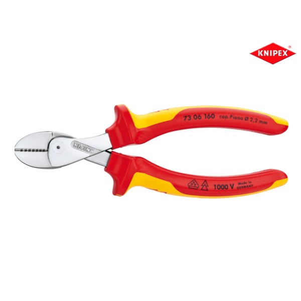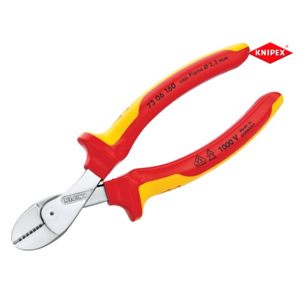 The Knipex 73-06 Series X-Cut Diagonal Cutters are fitted with multi-component grips, VDE tested up to 10,000V and safe for work up to 1,000V. They conform to DIN EN / IEC 60900. This box joint diagonal cutter is compact, light and simultaneously powerful and highly precise. With its wide range of cutting abilities, it offers versatility in industry, trades and crafts.