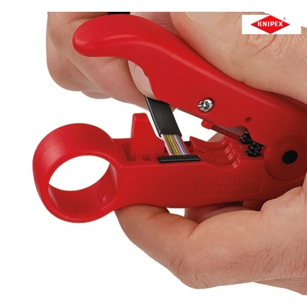The Knipex Wire Stripping Tool is for stripping outer sheath, shield, and insulation in a single process. It has an adjustable stripping blade for data cable, and two stripping blades for cutting and stripping telephone ribbon cable (4P/6P/8P) in a single operation.