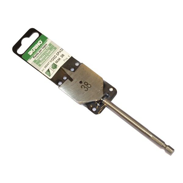 1 x Krino Flat Wood Drill Bit 38 x 160mm supplied in retail packaging with a hanging hook.
