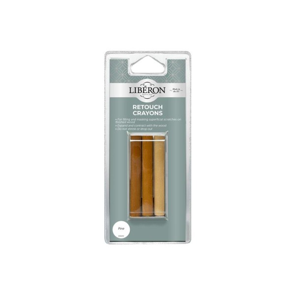 Liberon Retouch Crayons can be used to fill and mask superficial scratches on finished wooden surfaces and furniture, such as nail holes and worm holes. Applied with an easy rub on and buff off application, they expand and contract with the wood, do not shrink or drop out, and are available in a wide range of colours. For interior use only.