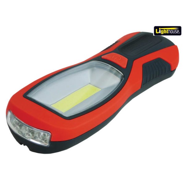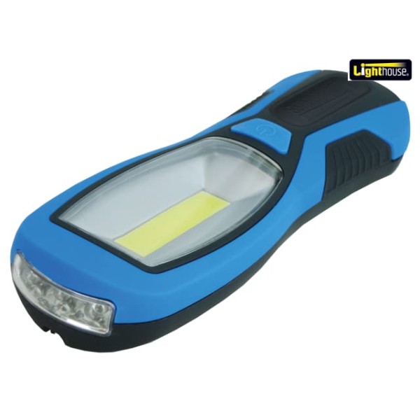 The Lighthouse LED Hand Lamp is a compact yet powerful double function LED lamp that operates as a torch or work light. Two types of light output: using either a 3 LED spotlight providing a 15 lumen spotbeam or a single COB LED that generates a bright 200 lumen work light. Fitted with a comfortable soft feel hand grip.