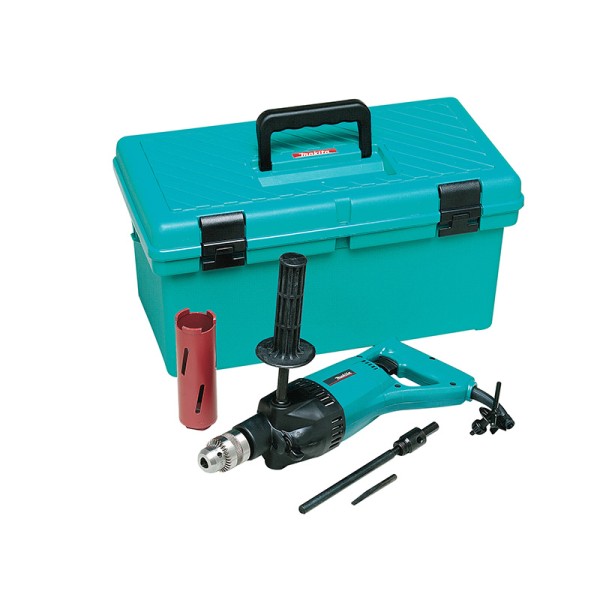 The Makita 8406X3 Diamond Core & Hammer Drill with a torque limiter and powerful motor. Comes with dry diamond core bits: 52, 107, 127mm and an adaptor pack.