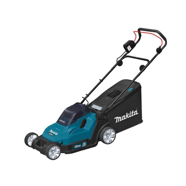 The Makita DLM432 LXT Lawnmower is powered by 2 x 18V Li-ion batteries in series to supply energy equal to a 36V DC motor drive system. Recommended for lawns up to 575m². Fitted with a single lever for cutting height adjustment and a rubberised handlebar for increased comfort. An electric brake provides additional user safety. The grass box features a handy grass level indicator.