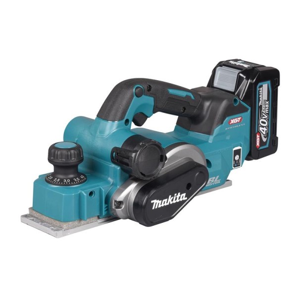 Makita KP001G XGT 40Vmax Planer with an electronically controlled brushless motor, to optimise battery energy use for longer run time per charge. A battery protection system automatically shuts off power when the battery level is low. Its compact design and good grip are made to reduce operator fatigue. The rubber coating on the handle ensures a firm working grip.