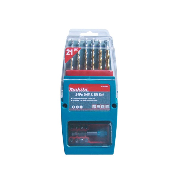 Makita P-57087 21 piece set supplied in a slim butterfly case includes a very valuable selection of the most useful accessories for drill and fix bits. This set of titanium coated HSS drill bits, regular masonry bits and screwdriver bits are perfect for a variety of applications.