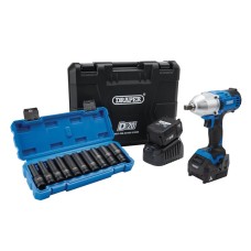 Part of the D20 multi-tool battery system. The cordless 1/2" square drive mid-torque impact wrench features a brushless motor and five torque presets: 100, 150, 200, 300 and 400N. Supplied with two D20 3.0Ah batteries and a charger. The 1/2" square drive metric deep impact socket set includes sizes: 10, 12, 13, 14, 15, 17, 19, 22, 24, 27mm. Supplied inside plastic storage case. The D20 interchangeable battery system allows you to combine the same battery/batteries with any of the tools within th..