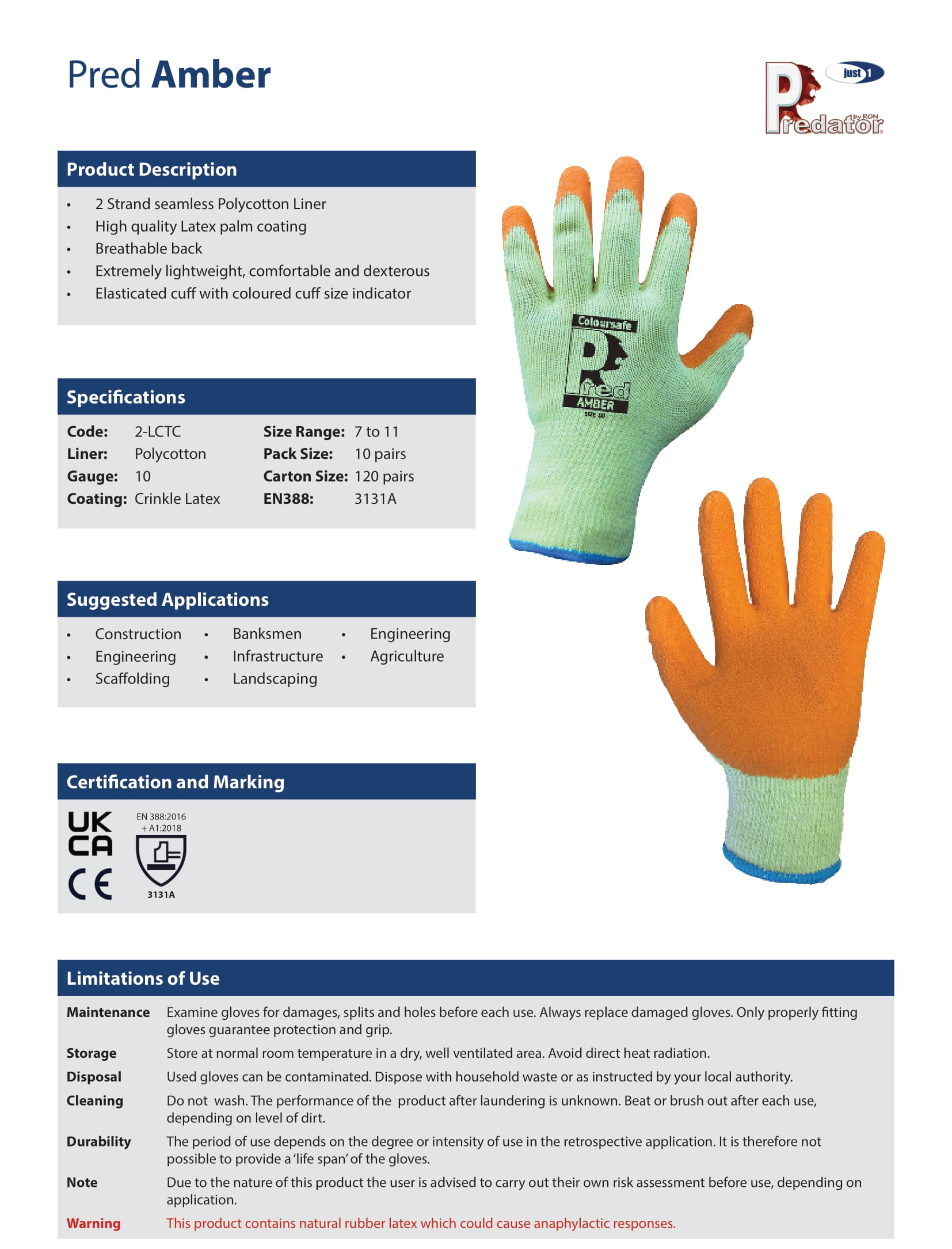 The Pred Amber consists of a 10 gauge, 2 strand, breathable, polycotton liner; palm coated in high-quality crinkle latex. Crinkle latex offers great grip properties.