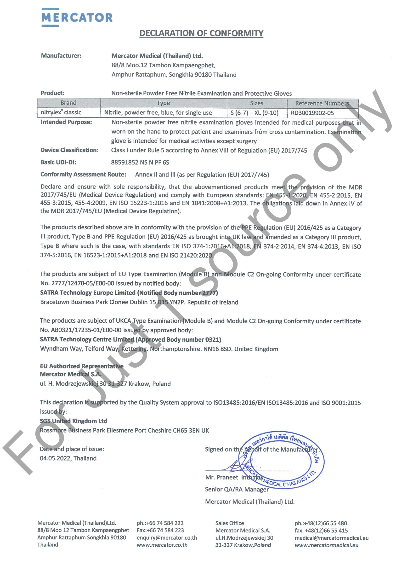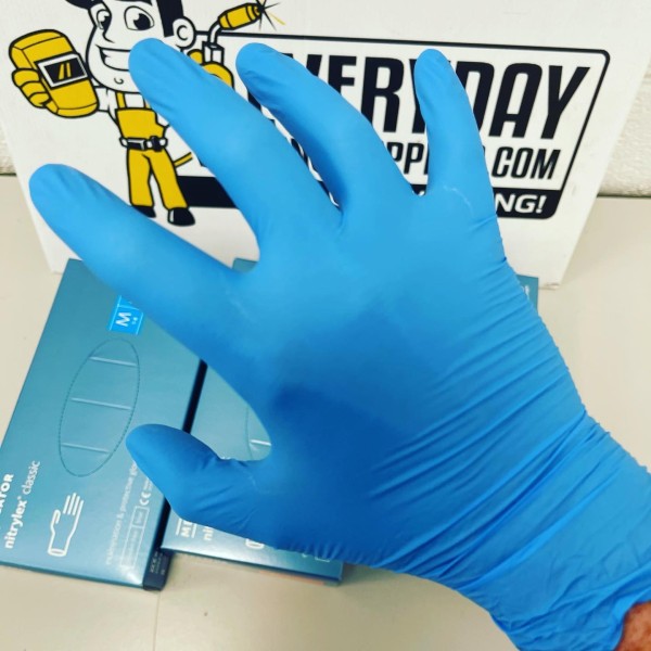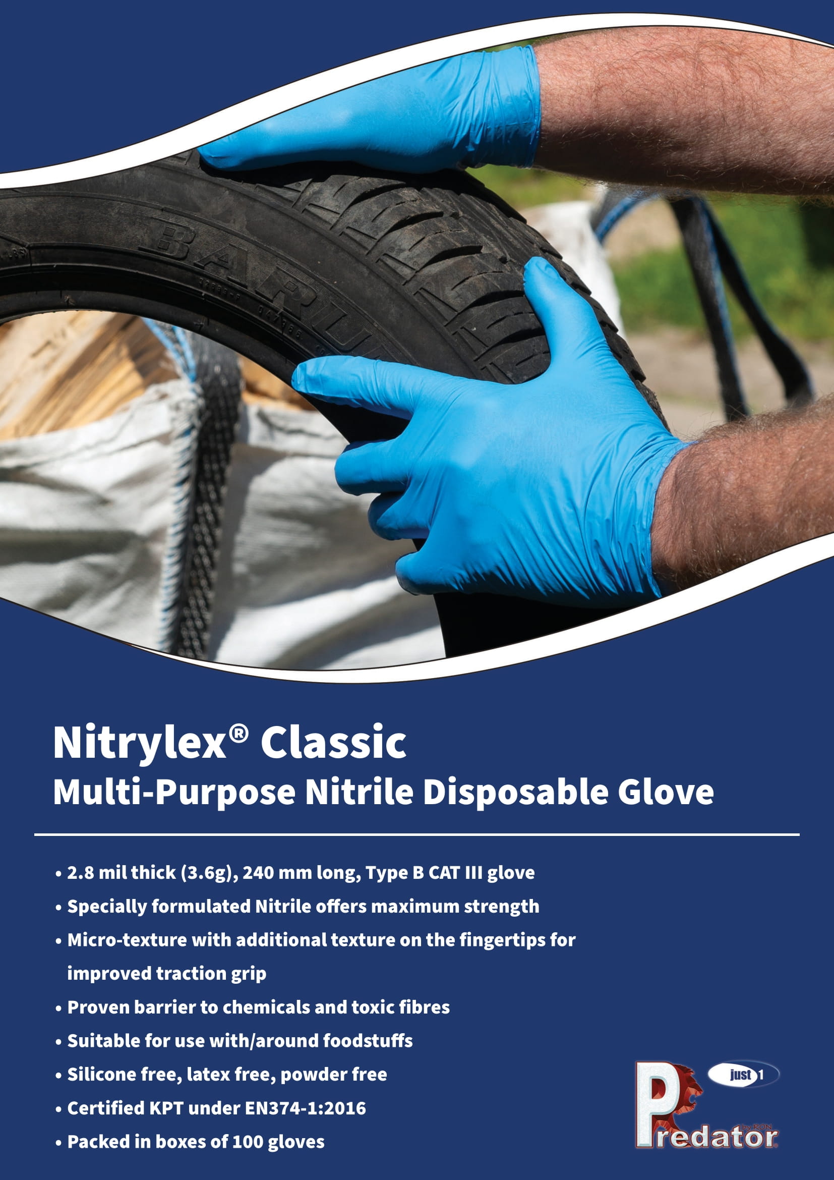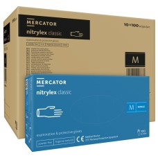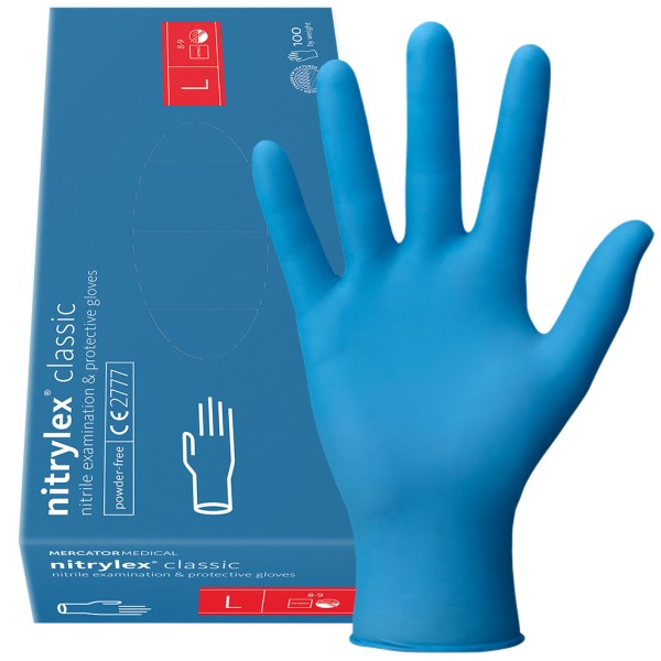 The Mercator Nitrylex® Classic is a 2.8 mil, 3.6 gram, 240mm long blue nitrile, type B glove. The Mercator Nitrylex® Classic is silicone-free, powder-free, and latex-free – offering superior strength whilst maintaining maximum dexterity. The Nitrylex® Classic has a microtexture with additional texture on the fingertips for improved pinch grip; is AQL 1.5; touchscreen-friendly; and, is suitable for use with/around food and foodstuffs.