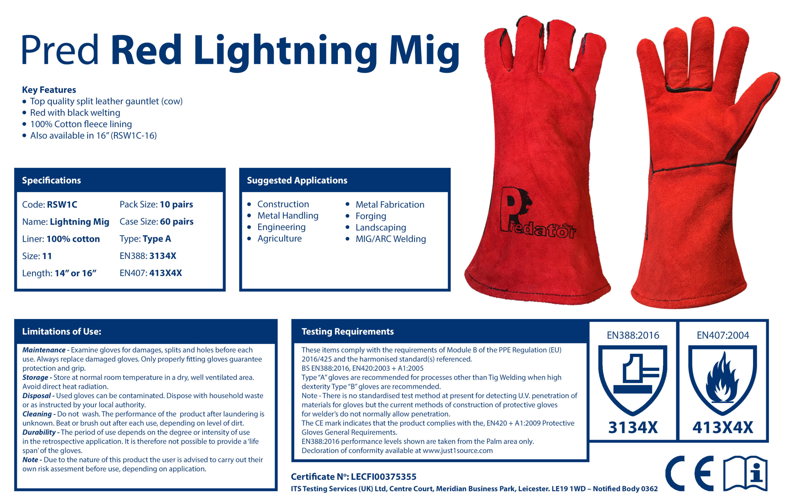 Predator Lightning 14" Welding Gloves / Gauntlets (Red) has been added to your cart