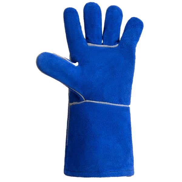 High quality, Blue, size 11, split leather MIG gauntlet. This gauntlet is lined over the hand and fingers with 100% cotton for additional heat resistance and comfort. This gauntlet has a turned cuff and black welting to protect the stitching from heat, increasing overall longevity.