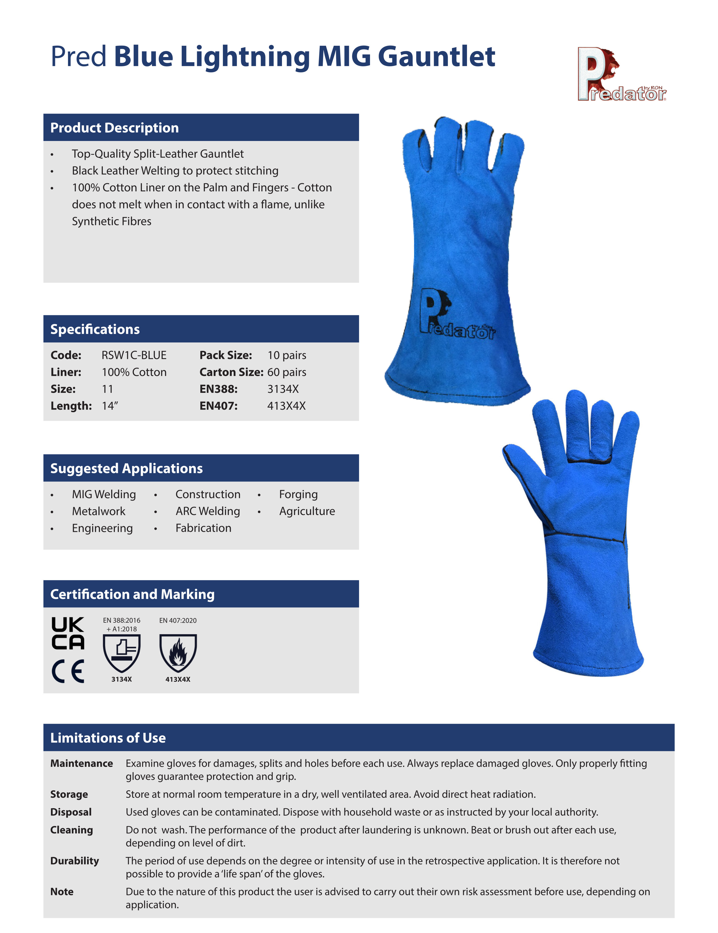 Predator Lightning 14" Welding Gloves / Gauntlets (Blue) has been added to your cart