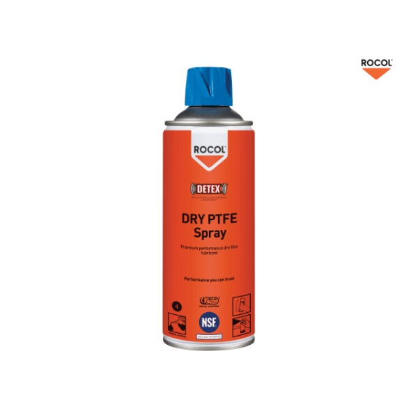 ROCOL DRY PTFE Spray is a non-staining lubricant which gives a low friction, non-toxic, non-stick surface and reduces static. Use on cams, slides, open bearings and chutes.
