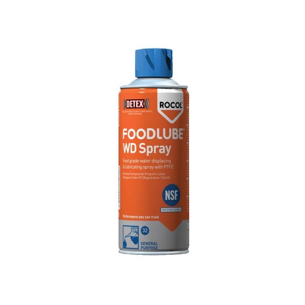 ROCOL FOODLUBE® WD Spray has a non-toxic, silicone-free formulation that is fortified with PTFE. Excellent anti-wear and lubricating properties with a superior penetrating and cleaning performance. Suitable for general use in food, beverage and pharmaceutical plants.