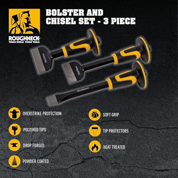 This Roughneck Bolster and Chisel, Three-Piece, Set is ideal for building and maintenance applications. The Brick and electricians’ bolsters are fitted with a soft grip with hand guard for overstrike protection.