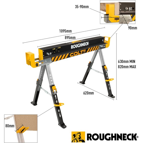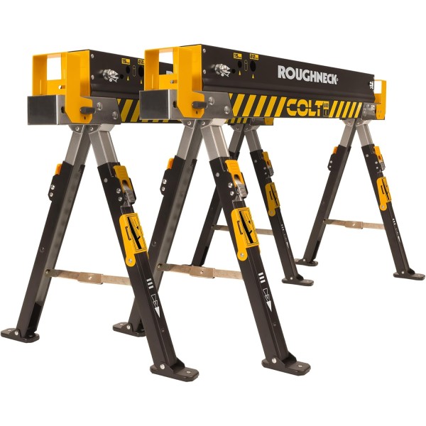 The ROUGHNECK COLT 600E Sawhorse is a tough, stable, versatile brute, a reliable addition to any job site. HEAVY DUTY STEEL construction ensures strength and durability when it matters most. Each COLT 600E Sawhorse stands its ground with an impressive weight-bearing capacity of 589kg, a substantial 1178kg when used as a pair.