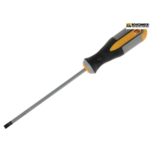 Roughneck Parallel Tip Screwdrivers with S2 steel blades, which have been hardened and tempered. They also have magnetic tips and triple injected soft grip handles. For easy identification, the screwdriver handle has the size and type clearly written on it, with a larger graphic at the end of the handle.