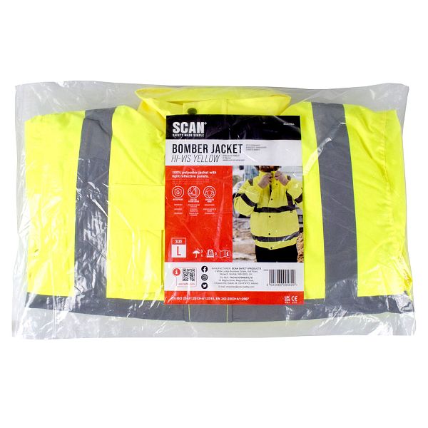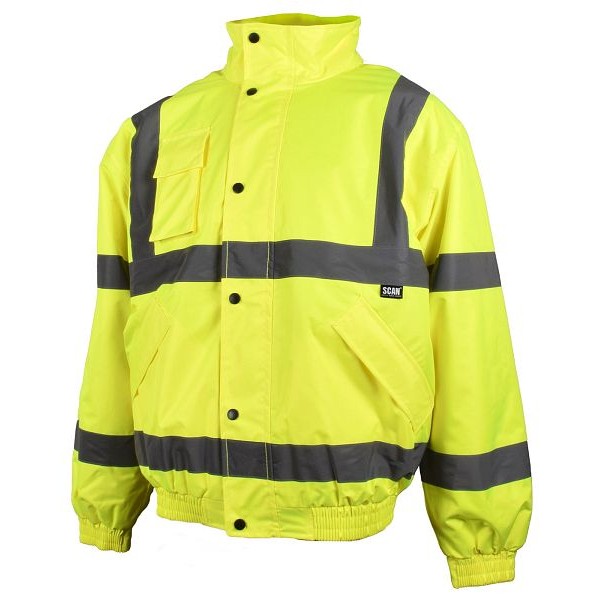 This Scan high-visibility waterproof bomber jacket conforms to EN ISO 20471 Class 3 and EN343 Class (3.1.X) for protective clothing against foul weather.