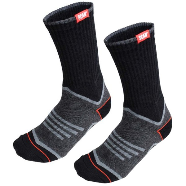 These Scan Work Socks have a reinforced heel and ergonomically shaped toe to produce an optimum fit. A non-slip bridge helps to maintain sock position. Supplied as a twin pack, 2 pairs included.