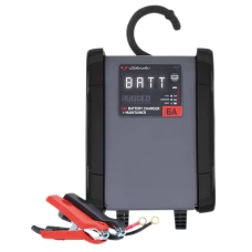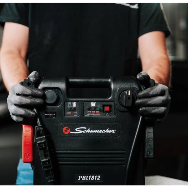 This Schumacher jump starter is perfect for daily use in car dealerships, garages, body shops, and by car enthusiasts. It can be used for cars, vans, campers, and heavier vehicles. The on/off switch prevents short-circuiting of the terminals and draining of the battery. The unit is easy to use with its color LED charging lights and battery level indicator. There is a 12V outlet which is also used for memory saver mode. The unit is equipped with a reverse polarity alarm, anti-spiking, and a 300A in-line fuse to protect against excessive current output. Designed to be robust, the unit is lightweight and compact with an integrated carry handle for portability.