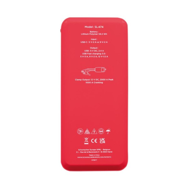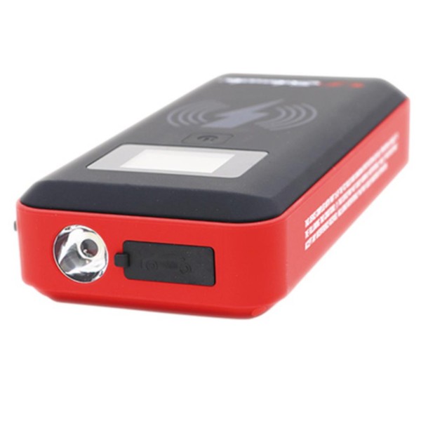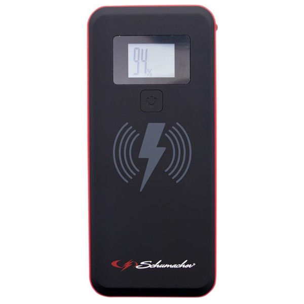 This compact Schumacher lithium jump starter and power bank is designed for on-the-go charging. Its advanced 16V 4-cell lithium technology provides superior starting performance for jump-starting 10L petrol and 7L diesel engines with 12V dead batteries. The Pre-Boost technology pre-charges deeply discharged batteries, and the Pre-heat mode warms the battery for optimal starting in low temperatures. The built-in flashlight offers flashing and SOS modes for emergency use. There is an easy to read LCD screen. In addition to jump-starting cars, the unit functions as a powerful battery pack offering wireless charging for Qi compatible devices and a USB-C output for charging mobile devices. For safety, the unit protects against reverse polarity, short circuit, low voltage, high temperature and reverse charging. Includes a smart cable with battery clamps, USB-C charging cable and storage case.