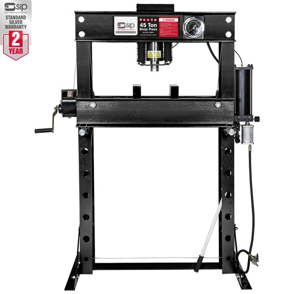 The SIP 45 TON Shop Press is free-standing pneumatic-operated press perfect for efficient and easy removal and installation of bearings, wrist pins, universal joints, and pulleys, plus bending, bonding, and straightening applications. A heavy-duty steel frame adds durability.