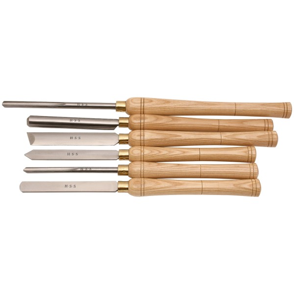 | Kit Contents: | 6pc; 5mm Parting Tool 10mm Spindle Gouge 30mm Oval Screw Chisel 20mm Round Nose Scraper 25mm Roughing Out Gouge 10mm Bowl Gouge |