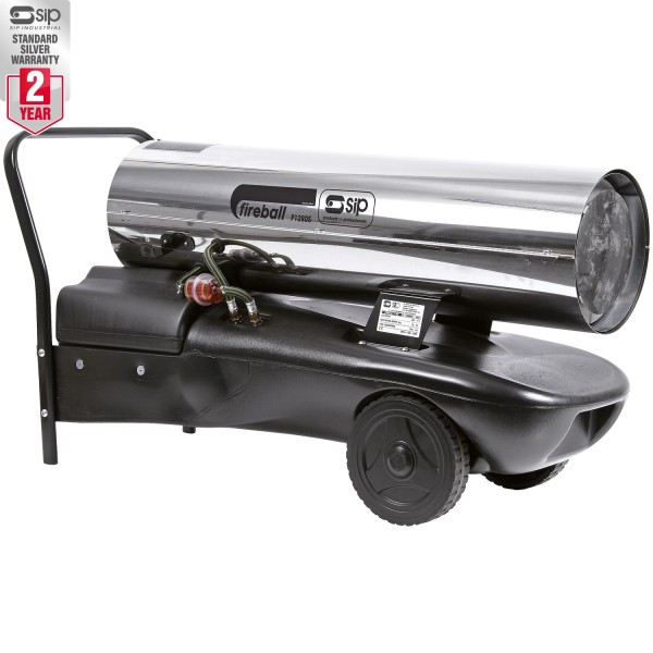 The SIP FIREBALL P1280S Professional Space Heater offers high mobility thanks to a raised wheel-mounted design with integrated legs, perfect for moving between and positioning in garage and workshop applications.