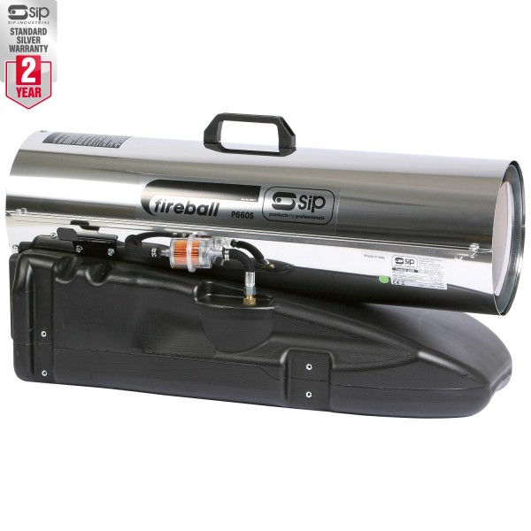The SIP FIREBALL P660S Professional Space Heater offers high portability thanks to a lightweight and compact design with easy carry handle, perfect for moving between and positioning in garage and workshop applications.
