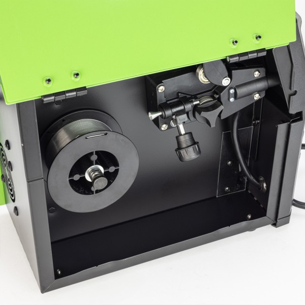 - Accessories included - Supplied with integrated 2mtr MIG torch, electrode lead, earth lead, gas hose with clamps, 0.7kg flux-cored wire reel, feed rollers, contact tips, chipping hammer/brush and face shield.