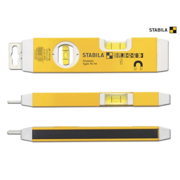 Stabila Torpedo Level, is a sturdy level with two shockproof vials (one horizontal and one vertical).