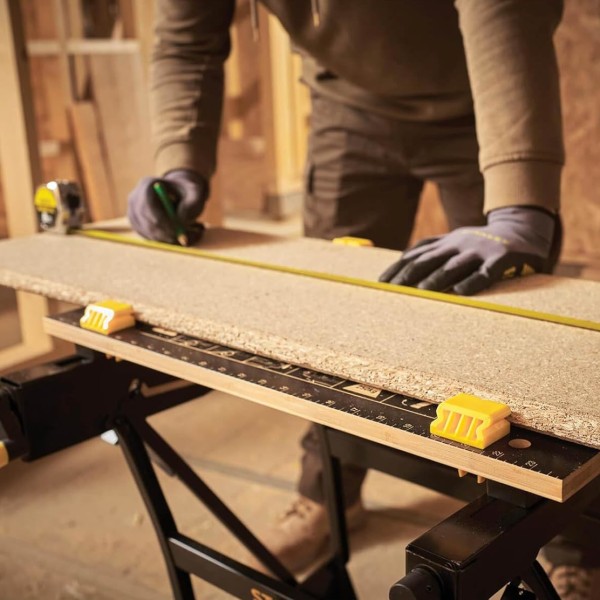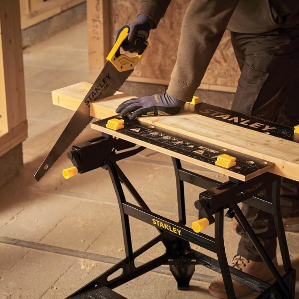 The STANLEY 2-in-1 Workbench & Vice features a robust and durable bamboo worktop with a removable middle plate. Removing the middle plate enables vertical clamping. It has two working heights (595/775mm) for flexible use depending on the application, eg. as a workbench, vice or sawhorse. The workbench is fitted with anti-slip feet for increased safety and it can be easily folded down for space-saving storage and easy transportation.
