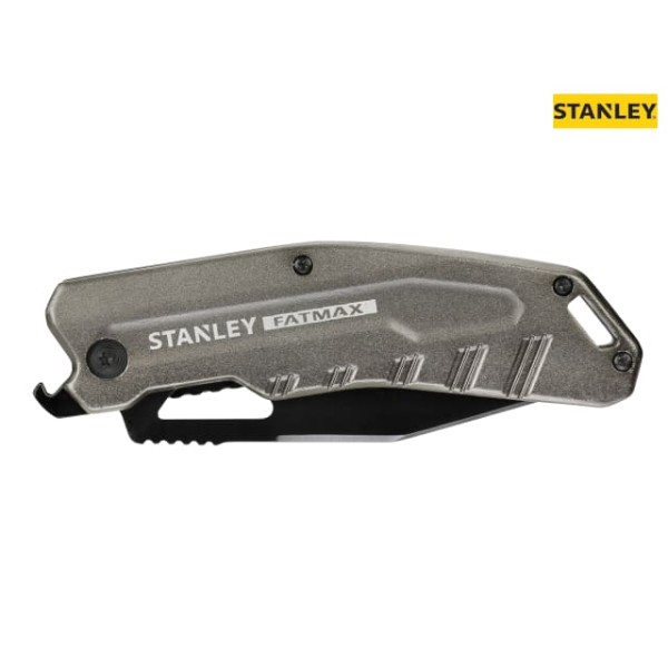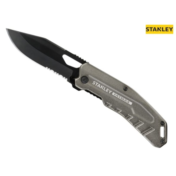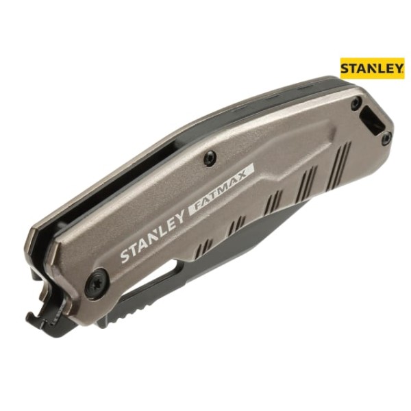 The Stanley Tools FatMax Premium Pocket Knife has a heavy-duty design with a stainless steel combination blade with both serrated and straight edges for cutting various materials. It also provides increased durability and corrosion resistance. The slim lightweight aluminium handle provides improved comfort. Other features include a tether loop for increased security and a bottle opener.