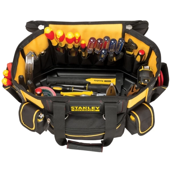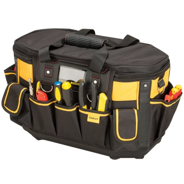 The Stanley FatMax™ Round Top Rigid Tool Bag has an outer made from 1200 denier ply fabric and has an inner, 600 denier polypropylene lining. This provides long lasting durability. The tool bag has a rigid and waterproof plastic base and its padded shoulder strap allows easier carrying of heavy loads. The bag has multiple compartments for many storage needs, with easy access pockets. The magnetic quick close operation of the '2 position' pockets allows tools to be secured while transporting and easily accessible when working.