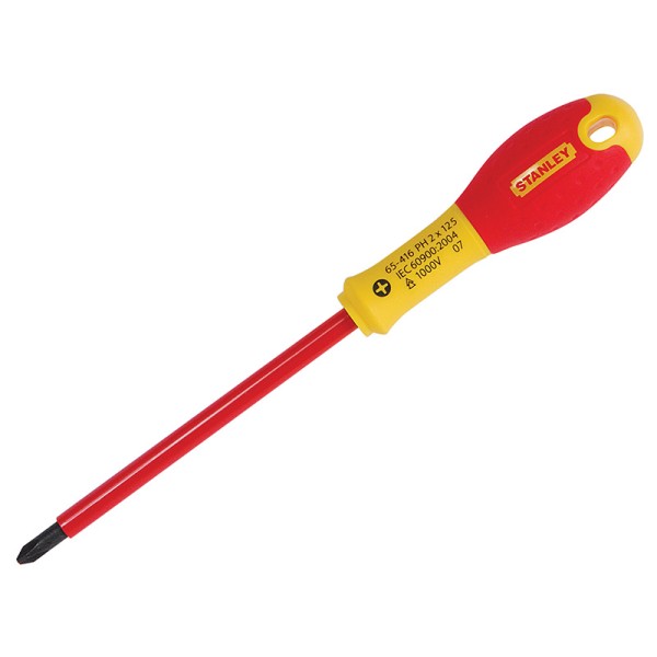 The Stanley FatMax® Phillips Tip VDE Insulated Screwdrivers have a VDE insulated screwdriver tip that is individually tested to 10,000 volts and guaranteed to 1,000 volts. The soft grip handle gives the perfect combination of great grip plus reduced fatigue and its large diameter offers greater torque needed for driving wood screws.