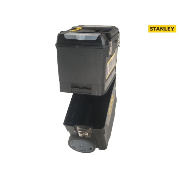 Stanley have produced a 2 in 1 mobile work station that separates in seconds into 2 units. The Stanley 193968 has an extra large toolbox with removable tray that maximises volume utility and a giant bin capacity. This Stanley mobile tool chest has many features in store and gives the user a top quality all round winner in tool storage with its swivel front drawer (carousel) and lid organizers for small parts, large trucking wheels for rough on site conditions, new one piece strong plastic handle, all weather nickel plated toolbox and side latches and with a load capacity of 88lbs you get a good array of tools at your side.