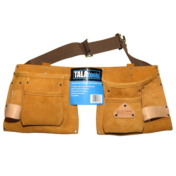 TALAtools Heavy-Duty Double Tool & Nail Pouch made from heavy-duty leather is double stitched for strength and riveted at stress points. With 10 pockets plus a tape clip and 2 hammer loops.