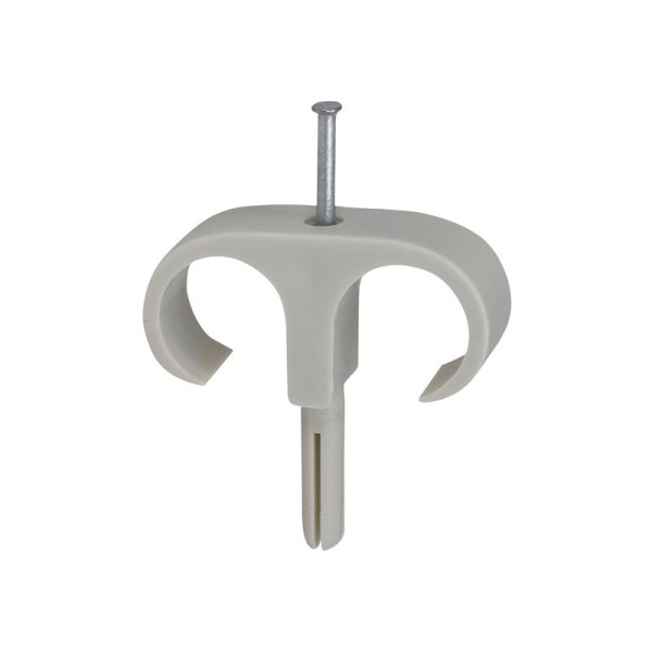 Box of 40 tillex® Double Plug Clips 18-22, Grey, 2.5 x 45mm, for installing round lead on flat surfaces. Quick and easy fixing, drill a hole with 5.5-6mm drill bit, mount plugs clip and hit the nail in. Suitable for brick and concrete.