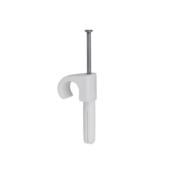 Box of 100 tillex® Plug Clips 10-14, White, 2.0 x 35mm, for installing round lead on flat surfaces. Quick and easy fixing, drill a hole with 5.5-6mm drill bit, mount plugs clip and hit the nail in. Suitable for both brick and concrete.