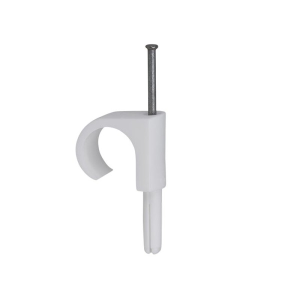 Box of 50 tillex® Plug Clips 18-22, White, 2.5 x 40mm, for installing round lead on flat surfaces. Quick and easy fixing, drill a hole with 5.5-6mm drill bit, mount plugs clip and hit the nail in, suitable for brick and concrete.