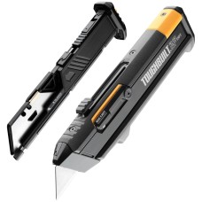 ToughBuilt leads through innovation, and the Reload Utility Knife is a breakaway example of how we continue to disrupt markets that have remained unchanged for far too long. The patented quick-reloading blade mechanism is actuated by a positive, smooth, rail-driven thumb button; after removing a used blade, depressing the slider, and returning it with a flick, it loads a new blade from the magazine. Internally, each mag holds 5 blades of any type, while the lower chamber reservoir contains room ..